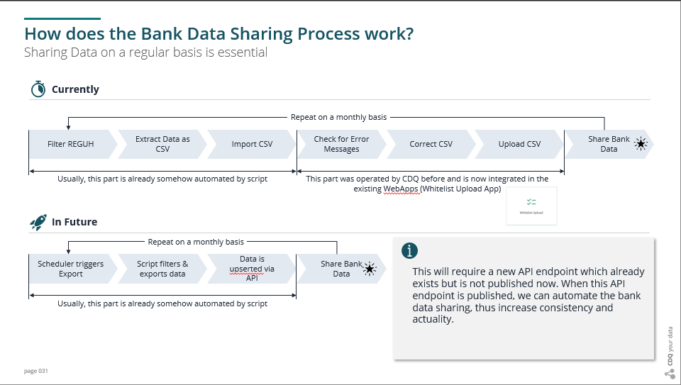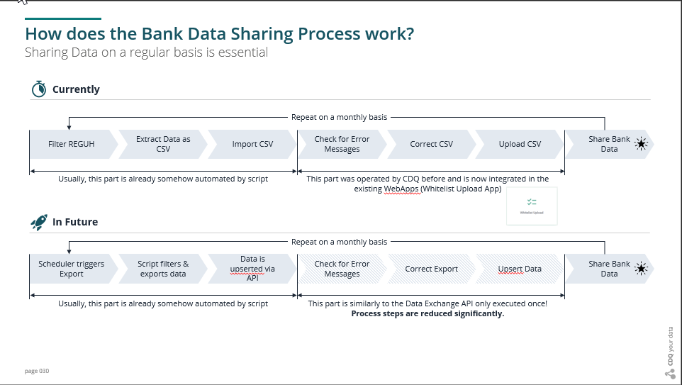 We currently use two different concepts when sharing business partner data and bank data. While business partner data can be synchronized seamless by using the Data Exchange API, customers have to upload their bank data via the whitelist upload browser. This makes it not only a manual process but is not in line with the CDQ data model which could even enable an upload via our normal data model, thus making the data existent in a data storage, data mirror. This could then enable batch bank trust score checks and monitoring on the bank data.