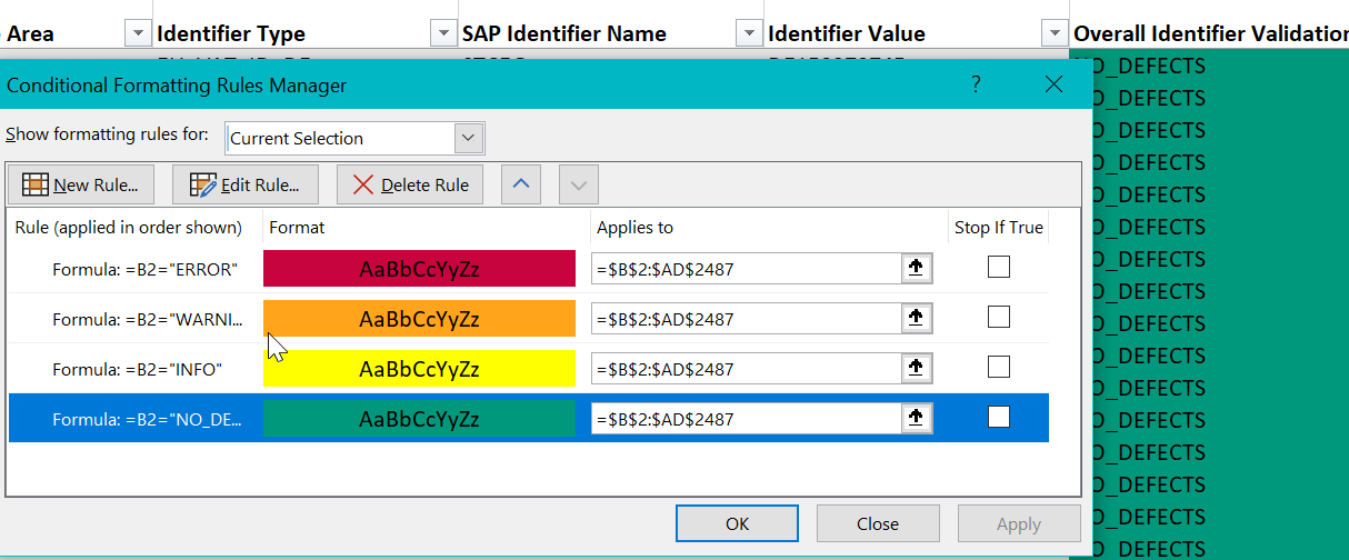 Good Idea, but please use colour coding based on conditional formatting carefully in Excel reports. Only apply the formatting to relevant columns. Current files have the Conditional Formatting assigned to the whole range with results, e.g. validation reports (see attached screenshot showing the applied range). This seems to slow down big result files significantly and has a performance impact on opening, filtering, or saving these files.